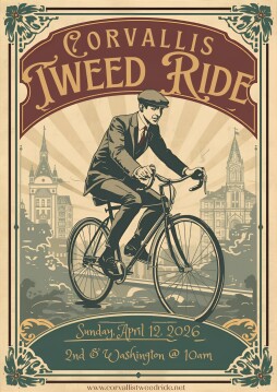 12th annual Corvallis Tweed Ride on Sunday, April 12, 2026. We shall congregate at the intersection of 2nd and Washington at 10am and commence upon a scenic tour of town. Vintage attire is encouraged. We will pause for a picnic, so pack a luncheon basket. The route will be an easy ~10 miles. The Corvallis Tweed Ride is a free annual bicycling event in Corvallis, Oregon that was established in 2015. Participants dress in vintage attire, recreating the spirit of a bygone era on a slow speed ride around town.