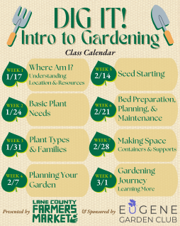 For 8 weeks, members of LCFM and the Eugene Garden Club will be teaching you the basics of gardening, from planning to planting! Come learn how to grow your own starting this Saturday, January 17th (our first market of the season!) through March 7th.