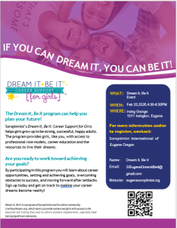 Dream It, Be It is a career support workshop sponsored by Soroptimist International of Eugene. The workshop is for girls 14-18 years and is designed to provide girls with access to professional role models, career education, and the resources to achieve and live their dreams. The program will assist in learning about different career opportunities, setting and achieving goals, overcoming obstacles to success, and moving forward after setbacks.