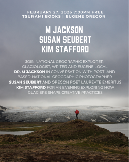 Join national geographic explorer, glaciologist, writer, and Eugene local Dr. M Jackson in conversation with Portland-based national geographic photographer Susan Seubert and Oregon poet laureate emeritus Kim Stafford for an evening exploring how glaciers shape creative practices.