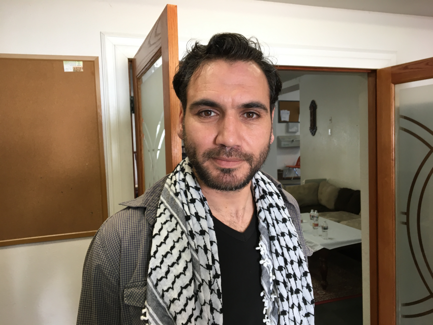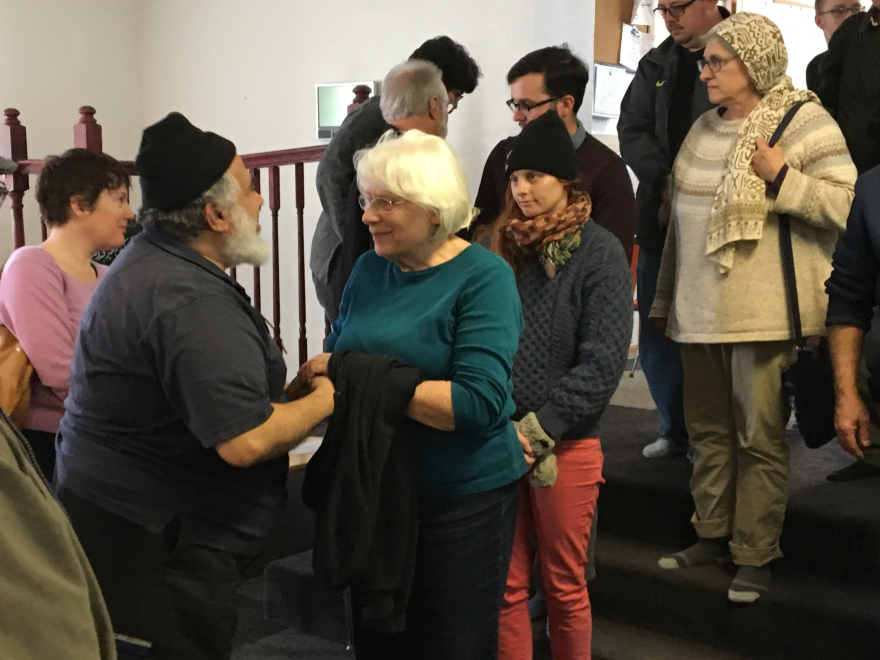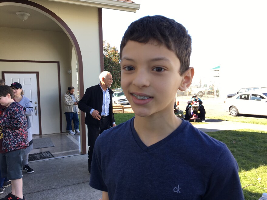 Community members of all faiths and backgrounds stood outside the Eugene Islamic Center in an act of solidarity while worshipers like young Zacharia Gliza, did their Friday prayer.