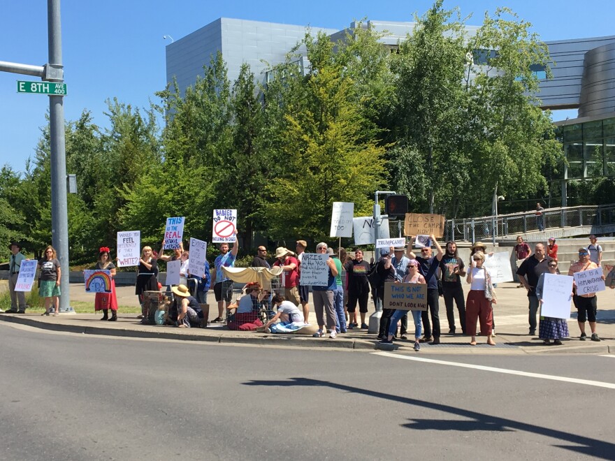 About 150 protesters showed up at the steps of the federal courthouse in Eugene, Saturday. They protested against the detainment of undocumented children by Immigration and Customs Enforcement at the U.S.-Mexico Border.
