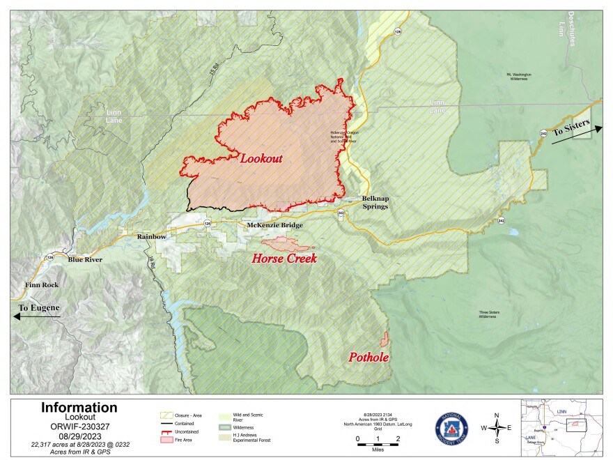 The Lookout, Horse Creek, and Pothole Fires 2023 burning in both Lane County and Linn County.