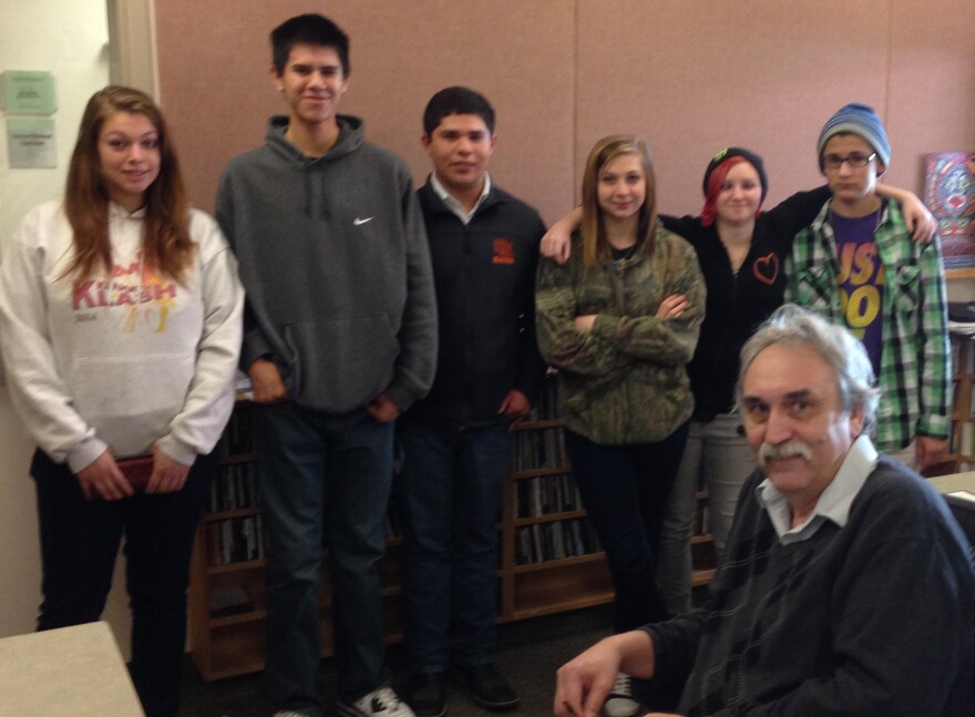 Program Director Don Hein explains the KLCC studio to students from Chiloquin High School on Feb 19. Chiloquin is a small town located north of Klamath Falls, and their high school has been granted a Low Power FM construction permit by the FCC. They came to Eugene to see an actual radio station in operation. Best of luck with your new station, Chiloquin High!!
