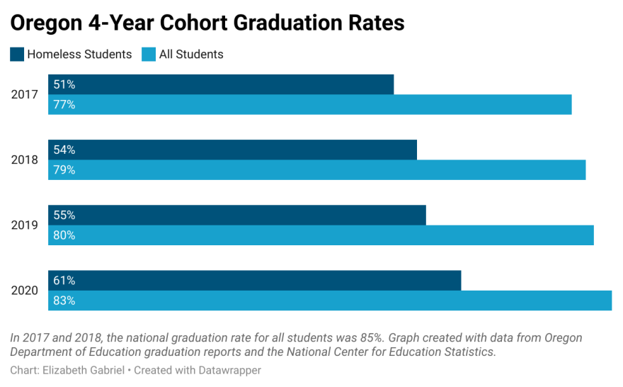 Graduating high school in Oregon isn’t always easy. Even though last year the state saw the largest graduating class on record, 20% of seniors still didn’t graduate. That is despite graduation requirements being loosened during the COVID-19 pandemic. If students are worried about finances, food and housing — and experiencing homelessness — it is even harder to get a diploma.