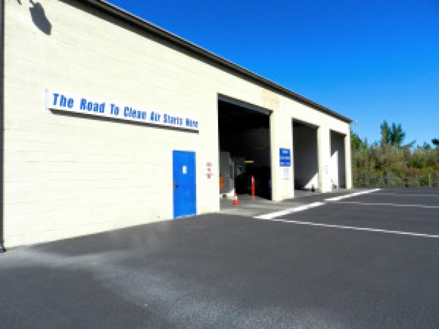At the vehicle inspection station in Medford, cars and trucks work their way through the open bays.