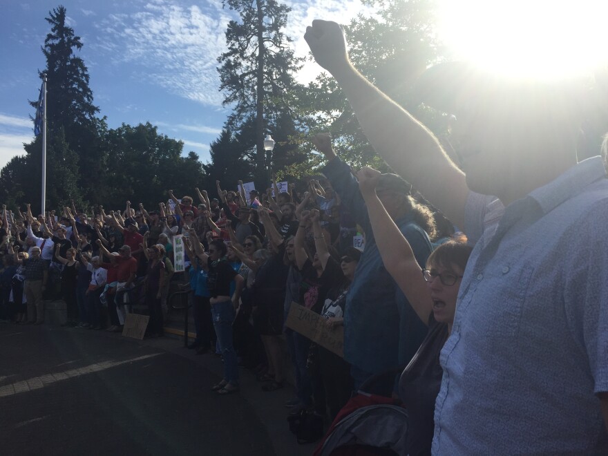 The rally and march for solidarity with Charlottesville began at the Erb Memorial Union on the University of Oregon campus and concluded at the park blocks across from the Lane County Courthouse. Rally organizer Anthony Samperio says the march came together and grew quickly following Saturday’s events.